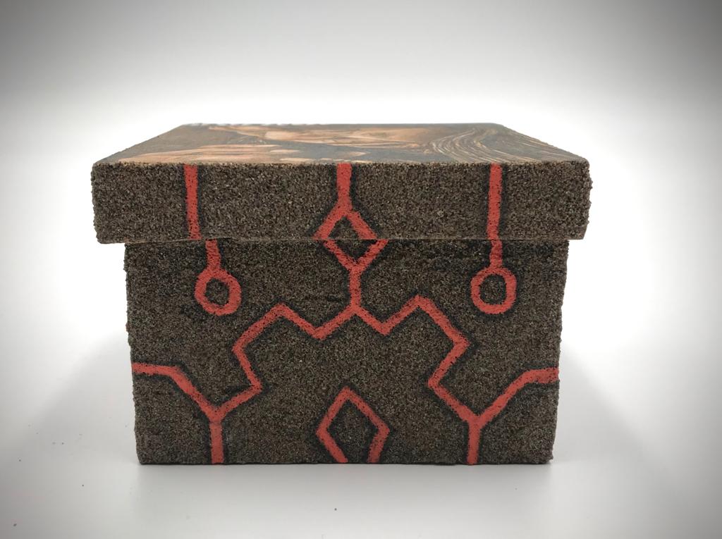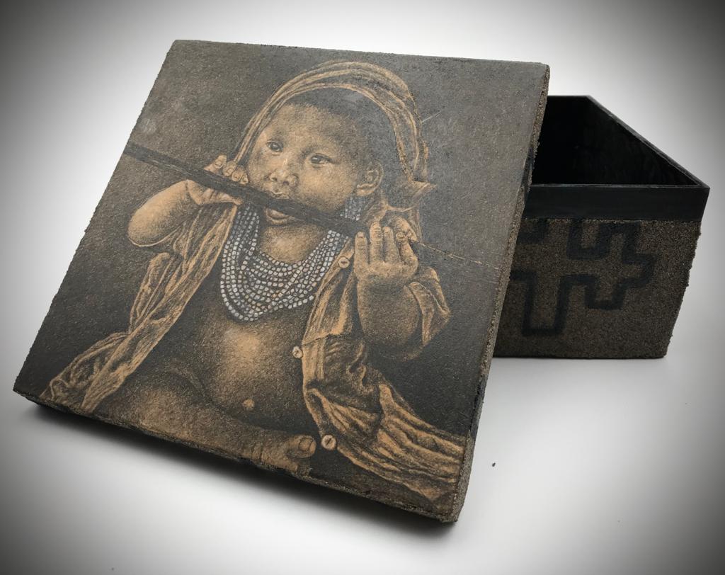 This unique collection is a rare creation of pencil etched onto hand painted, texturized wooden boxes. Each box is a one of a kind depiction of traditional Shipibo Conibo life and it's people.