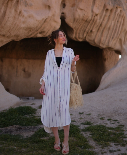 Striped Shirt Dress: The fabric is made of 100% pure organic double-layer muslin cotton. The soft and breathable shirt is also sustainable and ethically made. The double-layer design adds an extra layer of warmth and style, making it perfect for any season. Muslin fabric is known for its lightweight and airy texture. The breathable and absorbent nature of muslin cotton fabric keeps the skin cool and dry. It is also hypoallergenic and gentle on the skin, which makes it a great choice for sensitive skin. The shirt is also machine washable and easy to care for, making it a convenient and low-maintenance choice. This double-layer muslin cotton shirt is perfect for any occasion, whether it's a casual day out or a formal event.