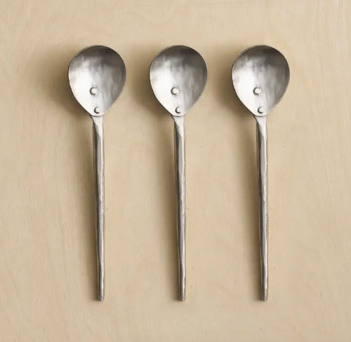 Forge Pewter Small Spoons: petite spoons designed for serving sauces, jams, and sugars—or stirring your morning cup. Each spoon is crafted from stainless steel with a subtly textured finish. Practical and distinctive, they bring a handcrafted touch to everyday moments.