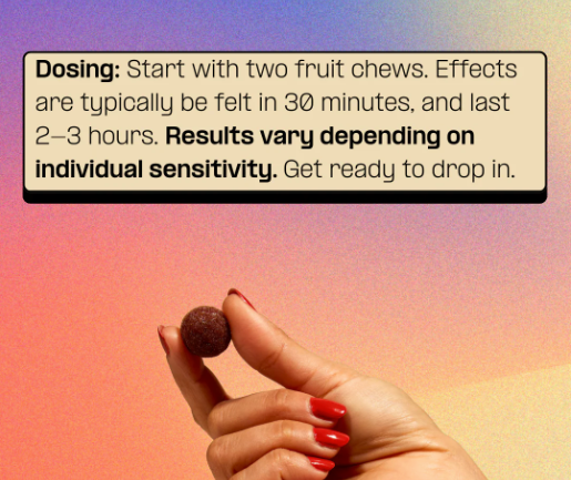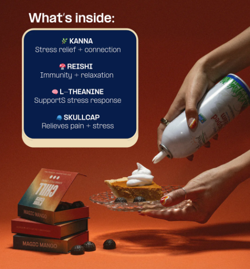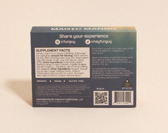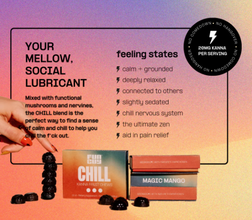 - CHILL GUMMIES: Tangy mango chews pairs with kanna + reishi to calm the nervous system and melt stress away. Each ⏺ contains 10mg high-potency kanna (5% alkaloids). Start with two ⏺ and work your way up for a more dropped in, mellow experience. Fast-acting kanna works to noticeably shift your mood in as little as 30 minutes.