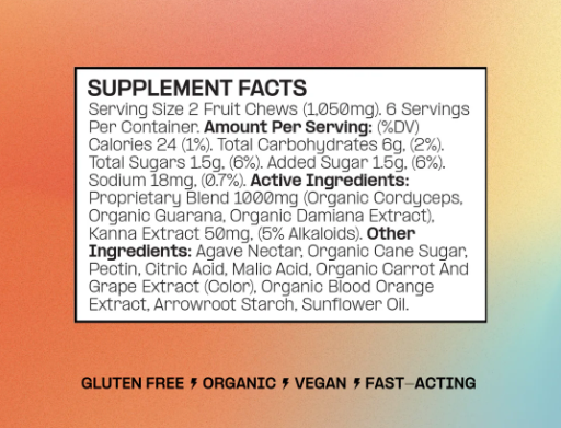 Other Ingredients: Agave Nectar, Cane Sugar, Pectin, Citric Acid, Malic Acid, Carrot and Grape extract (Color), MCT Oil, Blood Orange Extract, Arrowroot Starch.