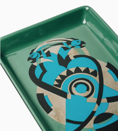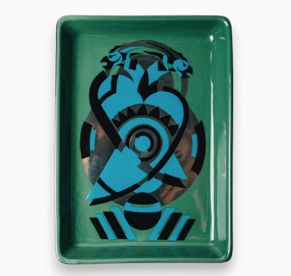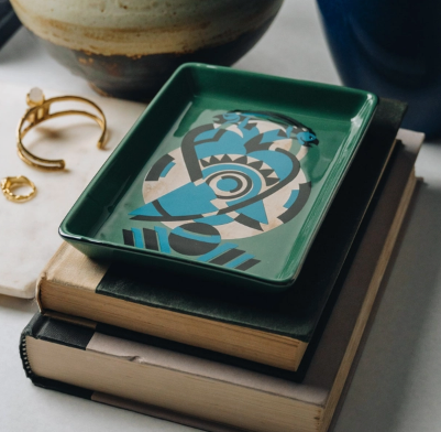 Two Birds Ceramic Tray: This striking 5" x 7" tray showcases an Art Deco-inspired stallion design in bold turquoise and black tones, accented with shimmering silver foil details. Set against a rich green background, the tray embodies strength and elegance through its geometric and symmetrical composition. Perfect for holding jewelry, keys, or other small treasures, the Deco Stallion Tray brings a touch of sophistication and modern artistry to any space.
