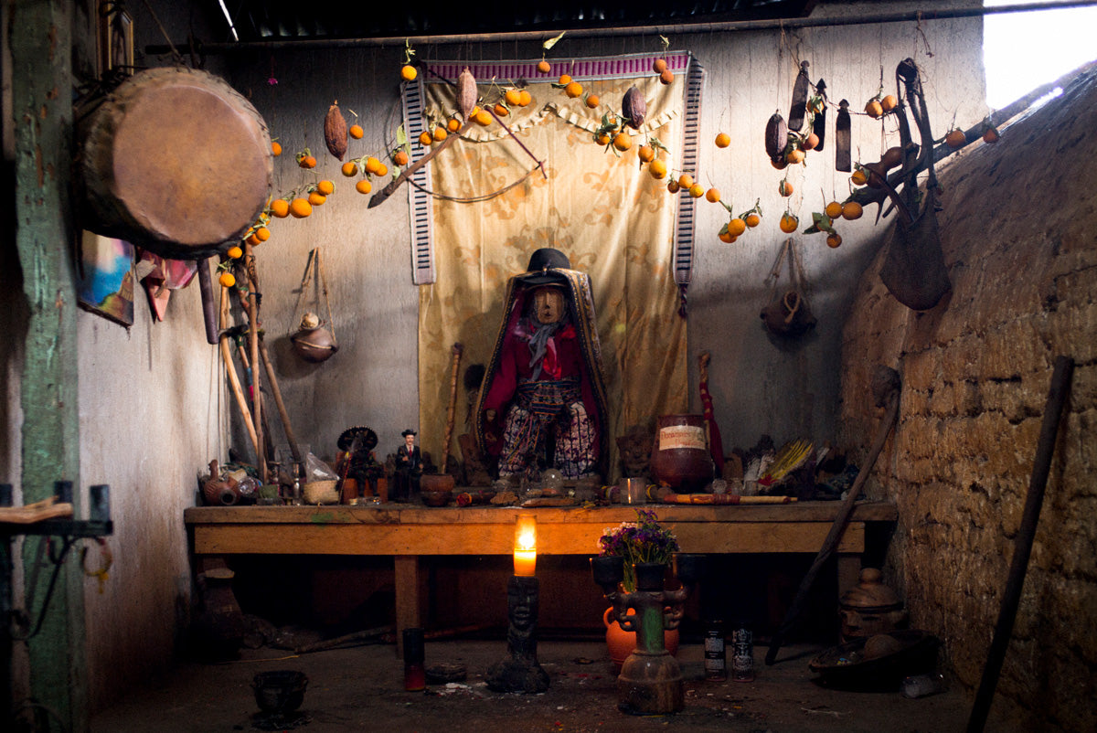 A rare moment in the presence of prayer at the foot of Guatemalan Elder, Tata Pedro's personal altar. Tata Pedro is a medicine man and teacher, a living bridge to the powerful ancestry of healing and spiritual devotion.