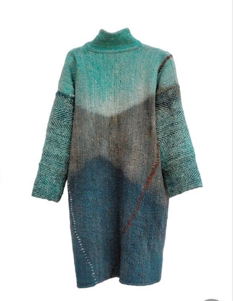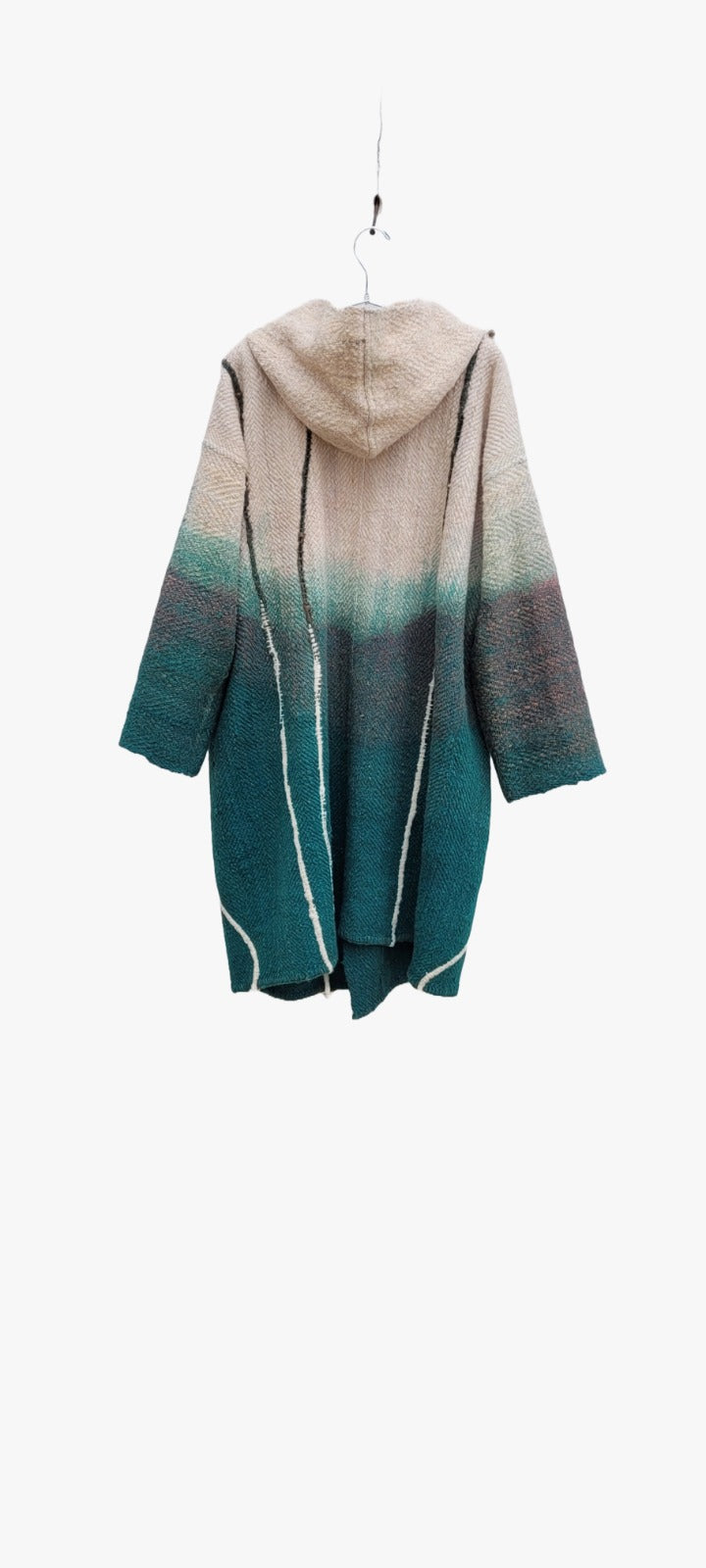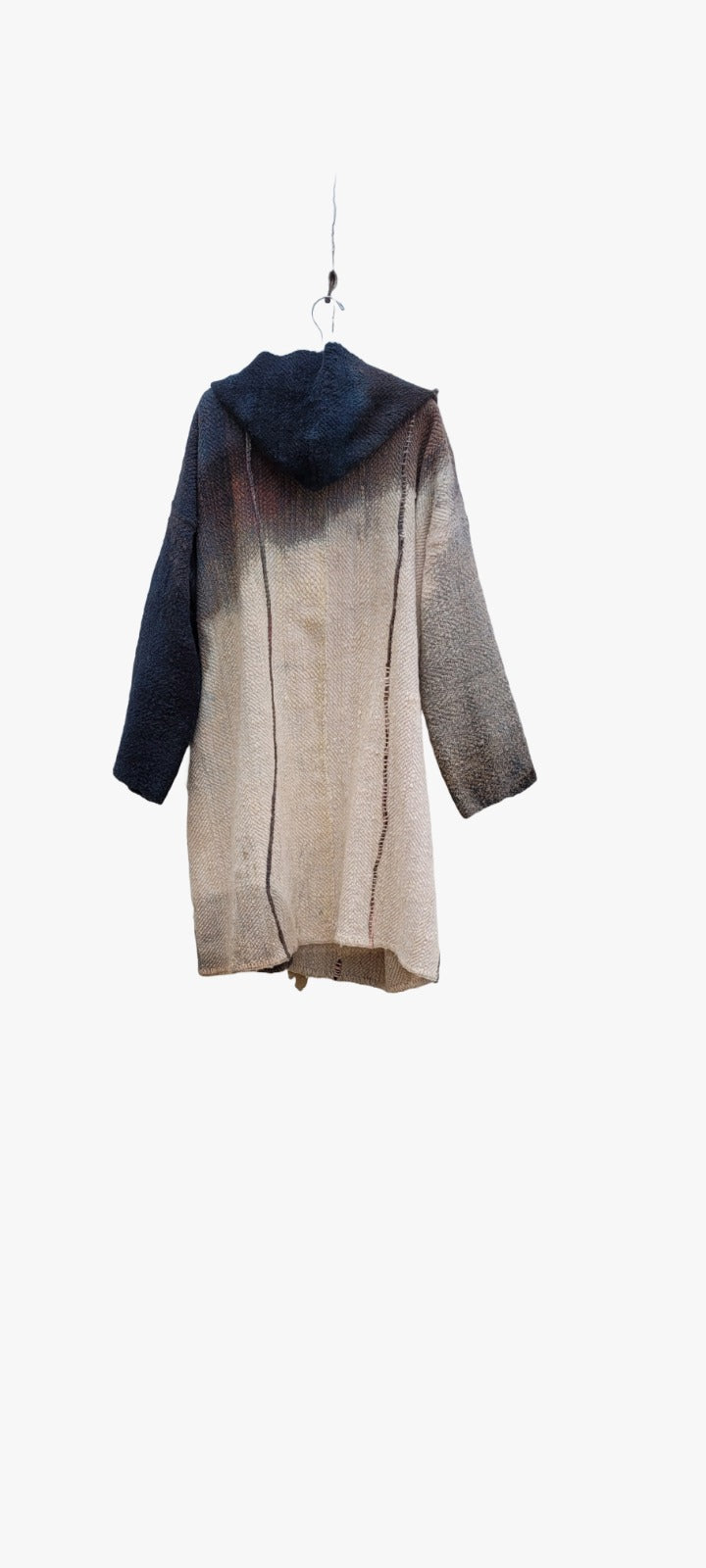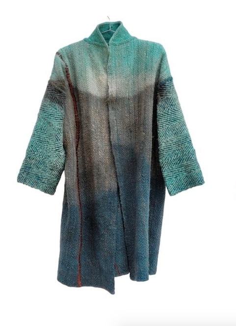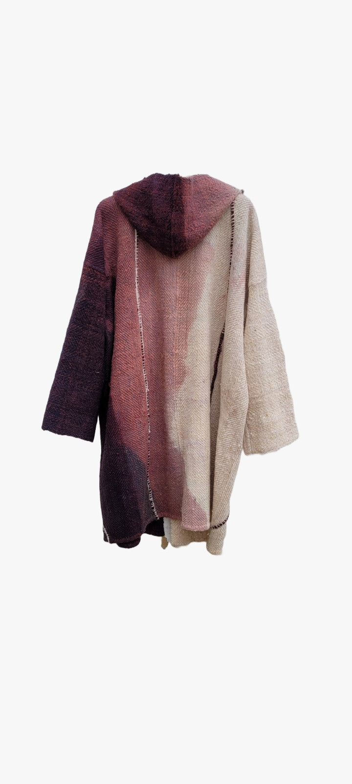 Details and variations include: Full oversized sleeves, deep pockets, complex woven color variation, hand felted trims -dyed from plants- which add an impressive accent component along the designs.