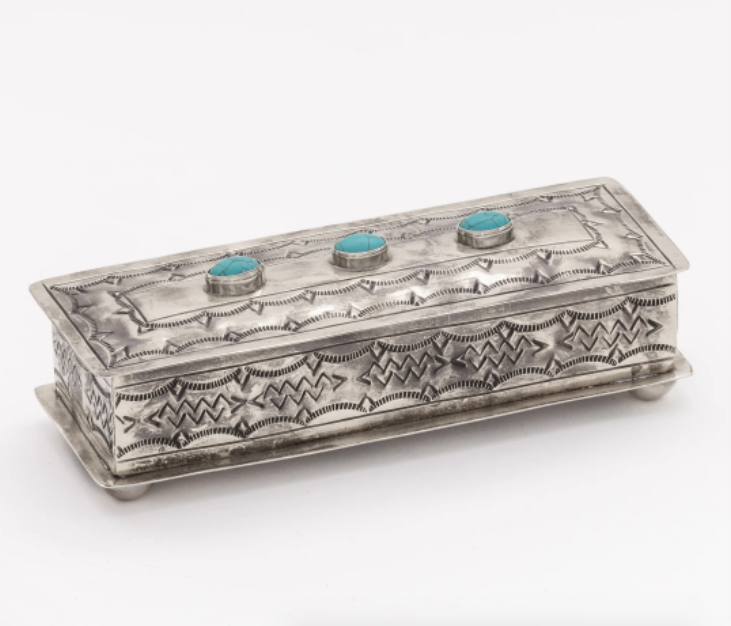 This Rustic Silver eyeglass box makes a great addition to any table top. It is embellished with rustic designs and three natural turquoise stones, always made one at a time, by hand.
