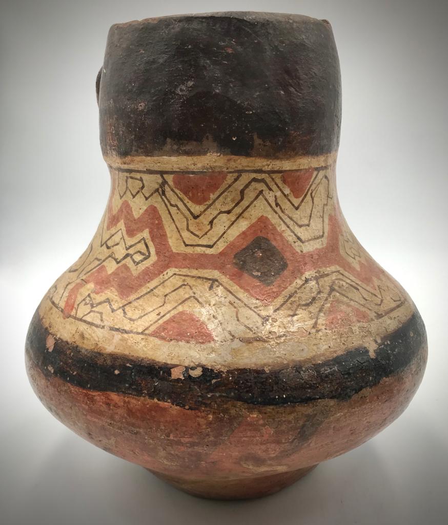 The antique works are early polychrome painted Shipibo Olla, likely dating back at least 50 years. With bold geometric painted patterns along with very fine lines. Their condition is good and quite nice for vessels from this period. Minor rim chips, surface erosion and areas of paint loss and fading, but all original. Intact with no breaks, cracks or repairs. These are wonderful examples with obvious signs of heavy indigenous tribal use.