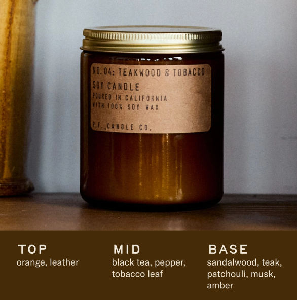 Teakwood & Tobacco: The one that started it all. Some call it the boyfriend scent, we call it the O.G. Notes of leather, teak, and orange.